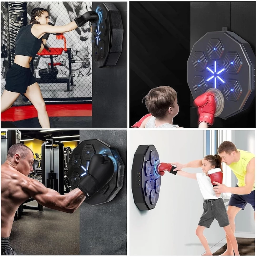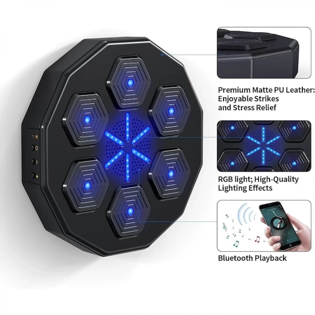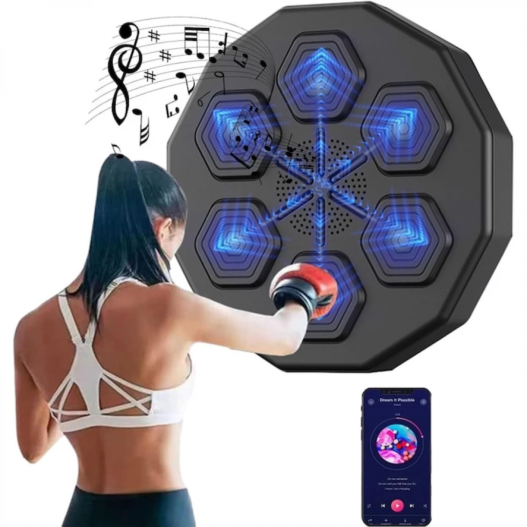 Boxul muzical inteligent este echipat cu difuzoare incorporate, permitandu-va sa va conectati cu usurinta dispozitivul prin Bluetooth si sa redati muzica preferata in timpul sesiunilor de box.