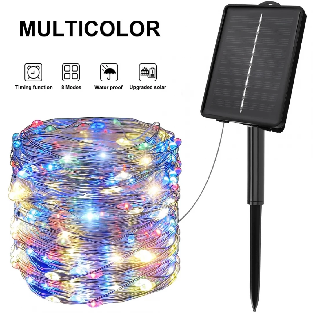 Cablul ghirlandei luminoase este din cupru aramiu, iar cablul de alimentare este transparent. Panoul solar are 2 butoane: ON/OFF si MODE (cu 8 tipuri de iluminat: continuu, intermitent, etc.) si se poate fixa pe sol folosind tarusul inclus.