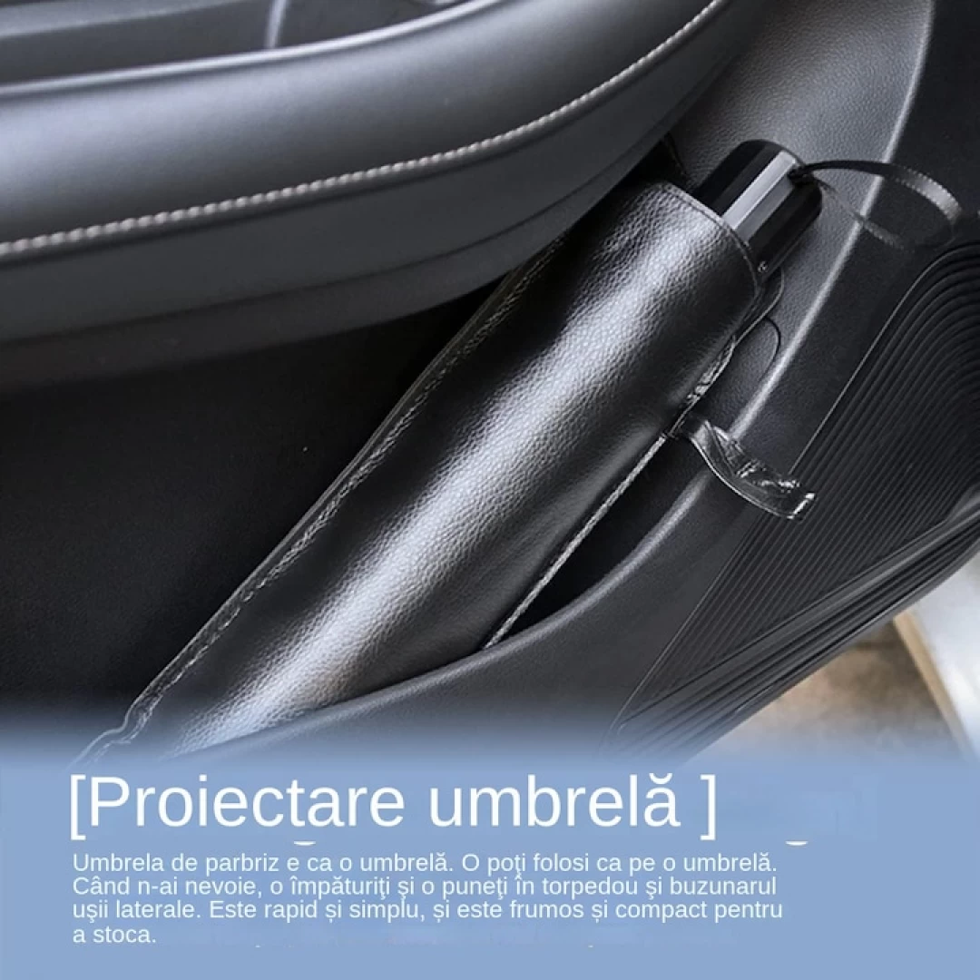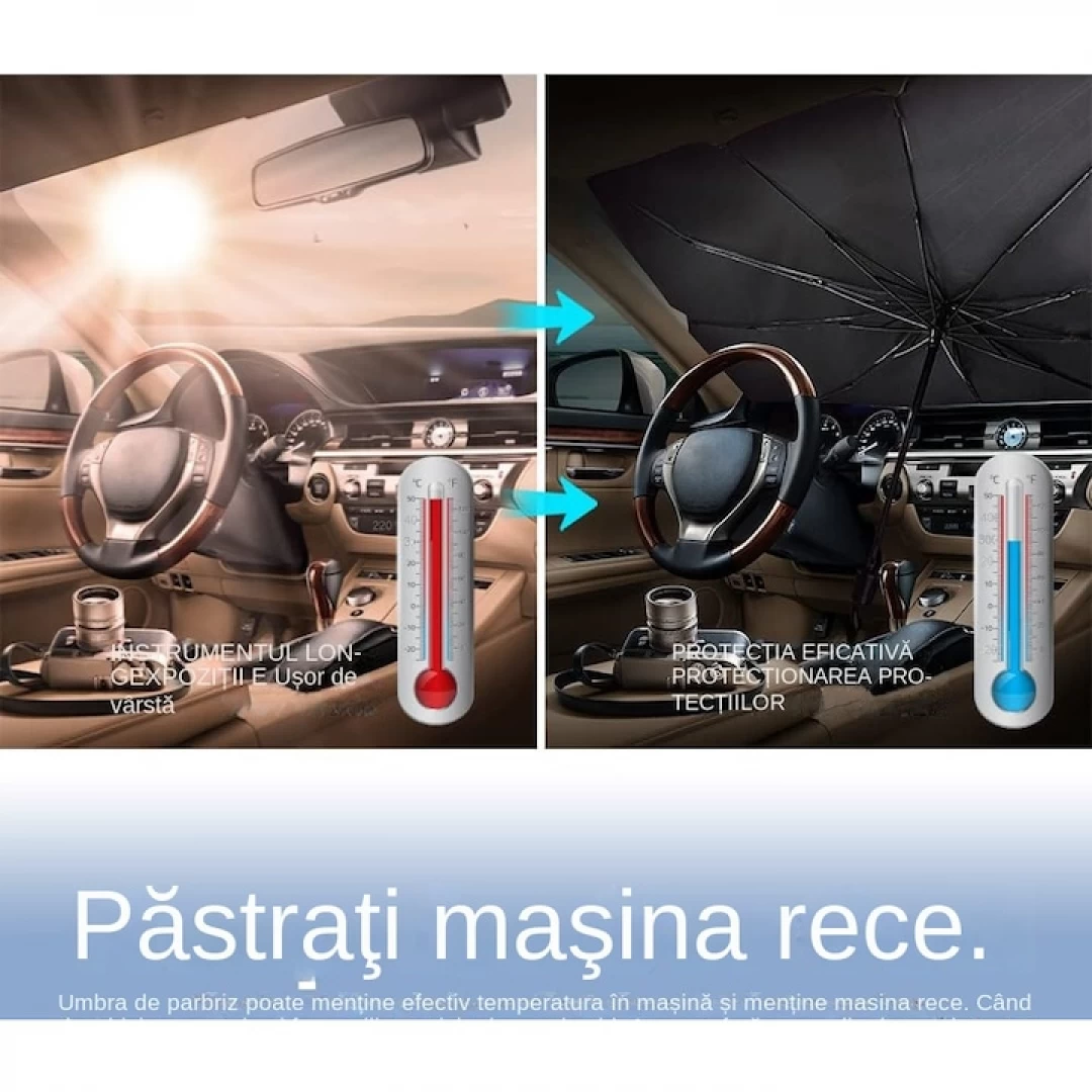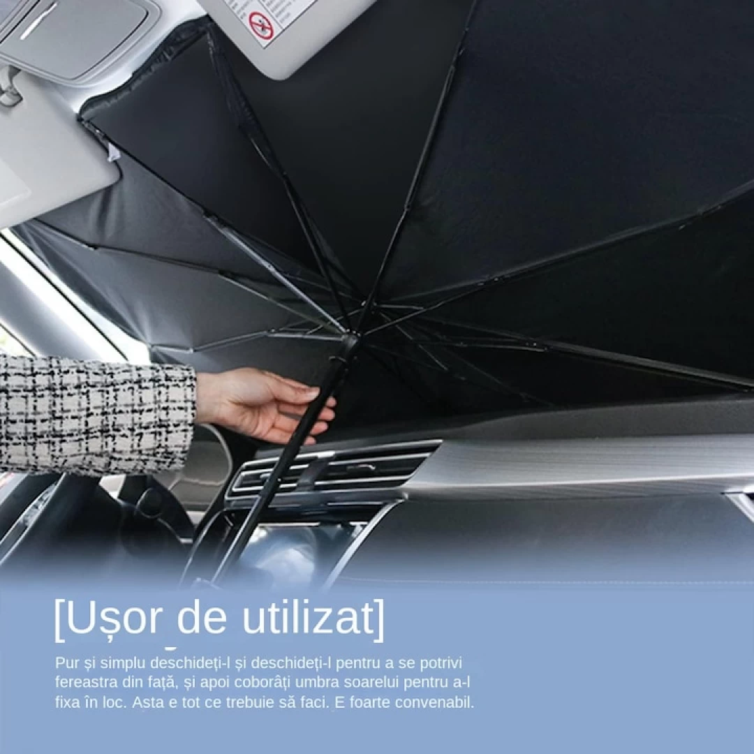 Parasolarul in forma de umbrela pentru parbrizul masinii este protectia ideala impotriva razelor solare si ajuta la reducerea temperaturii in interiorul masinii. Pregatit pentru a fi folosit imediat, parasolarul este comod, usor de depozitat si de folosit.